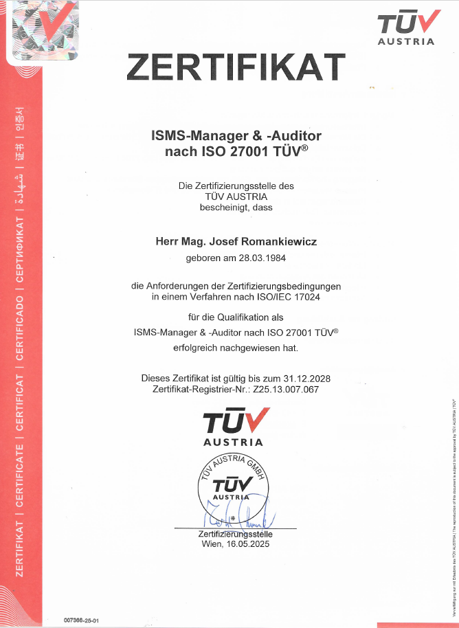 Mit Freude können wir bekannt geben, dass die Zertifizierung zum ISMS-Manager & -Auditor nach ISO/IEC 27701, erfolgreich, von unserem Kollegen Josef, abgeschlossen wurde. Die vom TÜV ausgestellte Zertifizierung bestätigt die fundierten Kenntnisse im Bereich Datenschutz-Management sowie die Fähigkeit, ein Datenschutz-Informationssicherheitsmanagementsystem (PIMS) gemäß der internationalen Norm ISO/IEC 27701 aufzubauen, zu betreiben, zu auditieren und kontinuierlich zu verbessern.